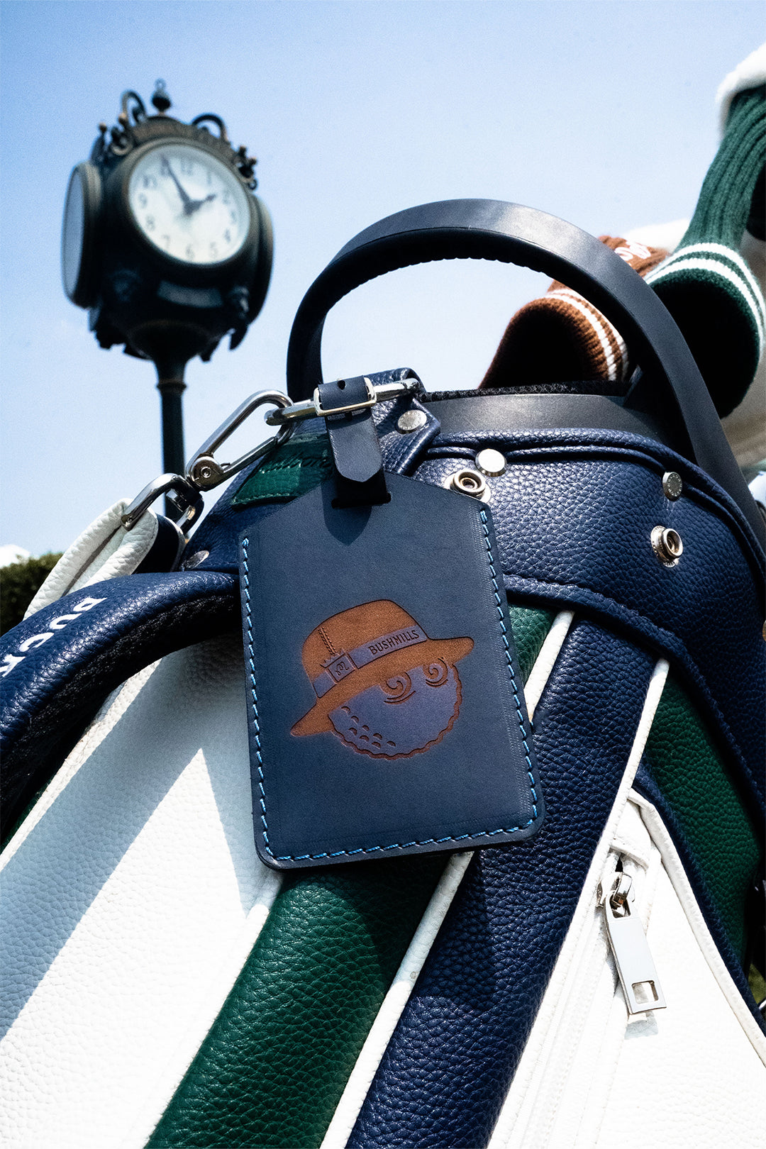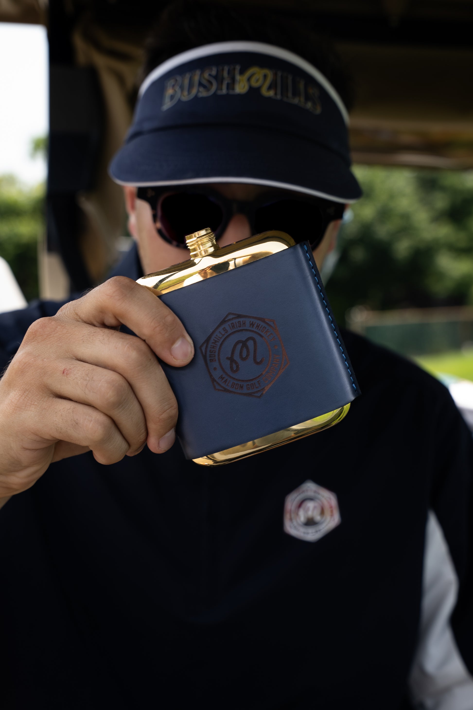 The Malbon x Bushmills Flask & Luggage features Irish craftsmanship, created in Ireland with bespoke navy leather wrapped around a gold flask and matching navy leather luggage tag, for your golf bag or upcoming travel